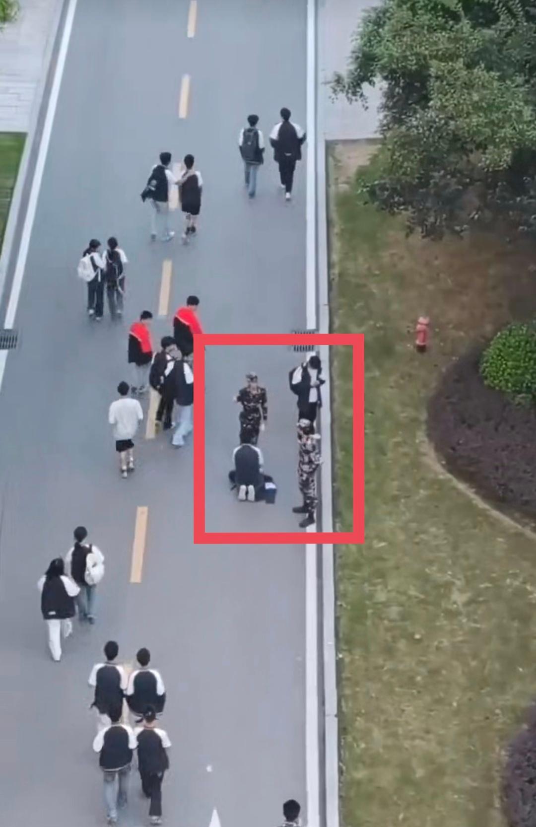 现场视频画面显示,在人流密集的校园内,两位身穿迷彩服的人员拦住一位学生的去路,这名学生双膝跪地正对着一名人员磕头。这段视频被发布到网上后引起广泛关注和无端揣测,其中一条视频的下方评论达700多条,有高赞评论称,“纠察队查到了学生带充电宝,学生在求饶。”
